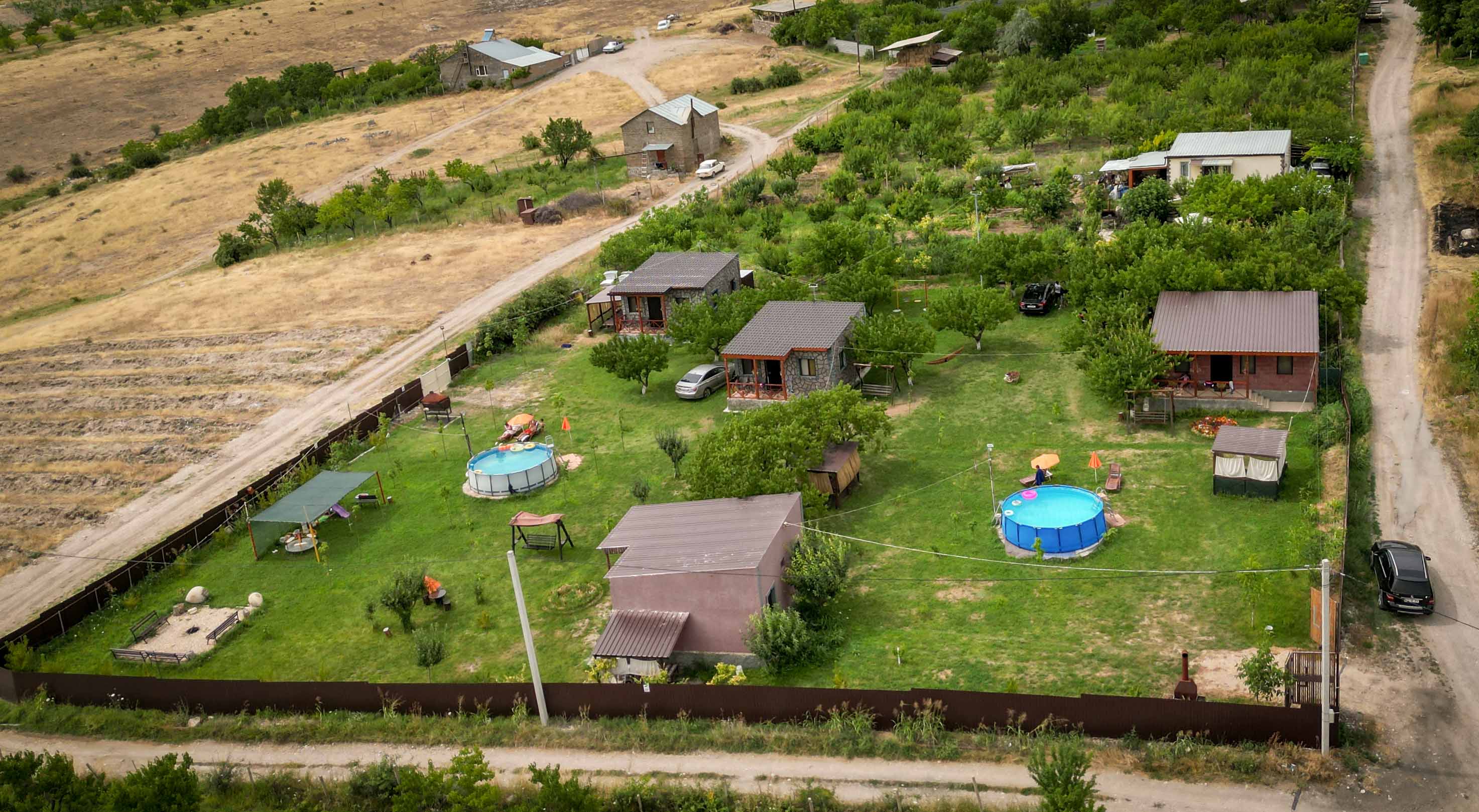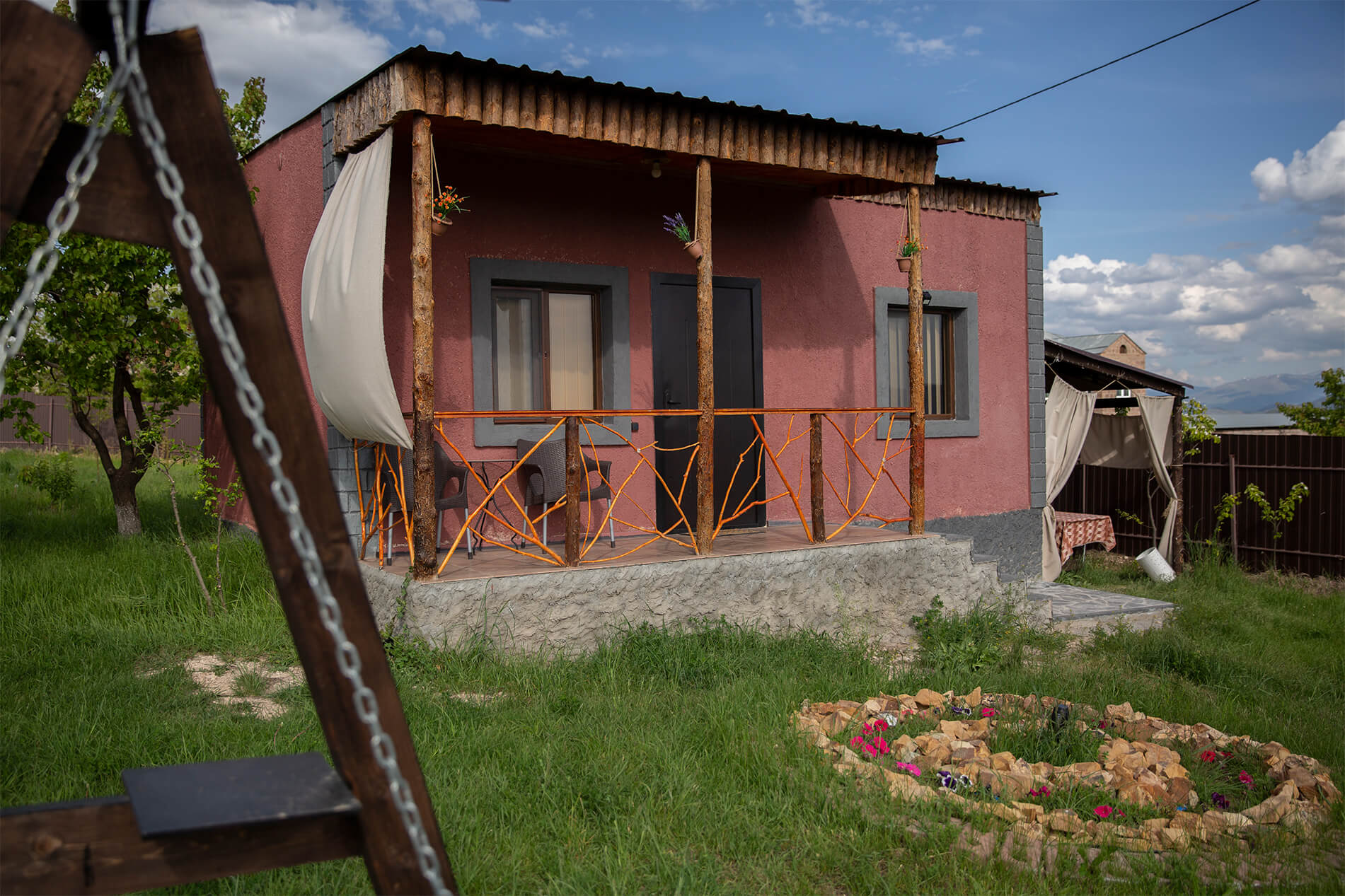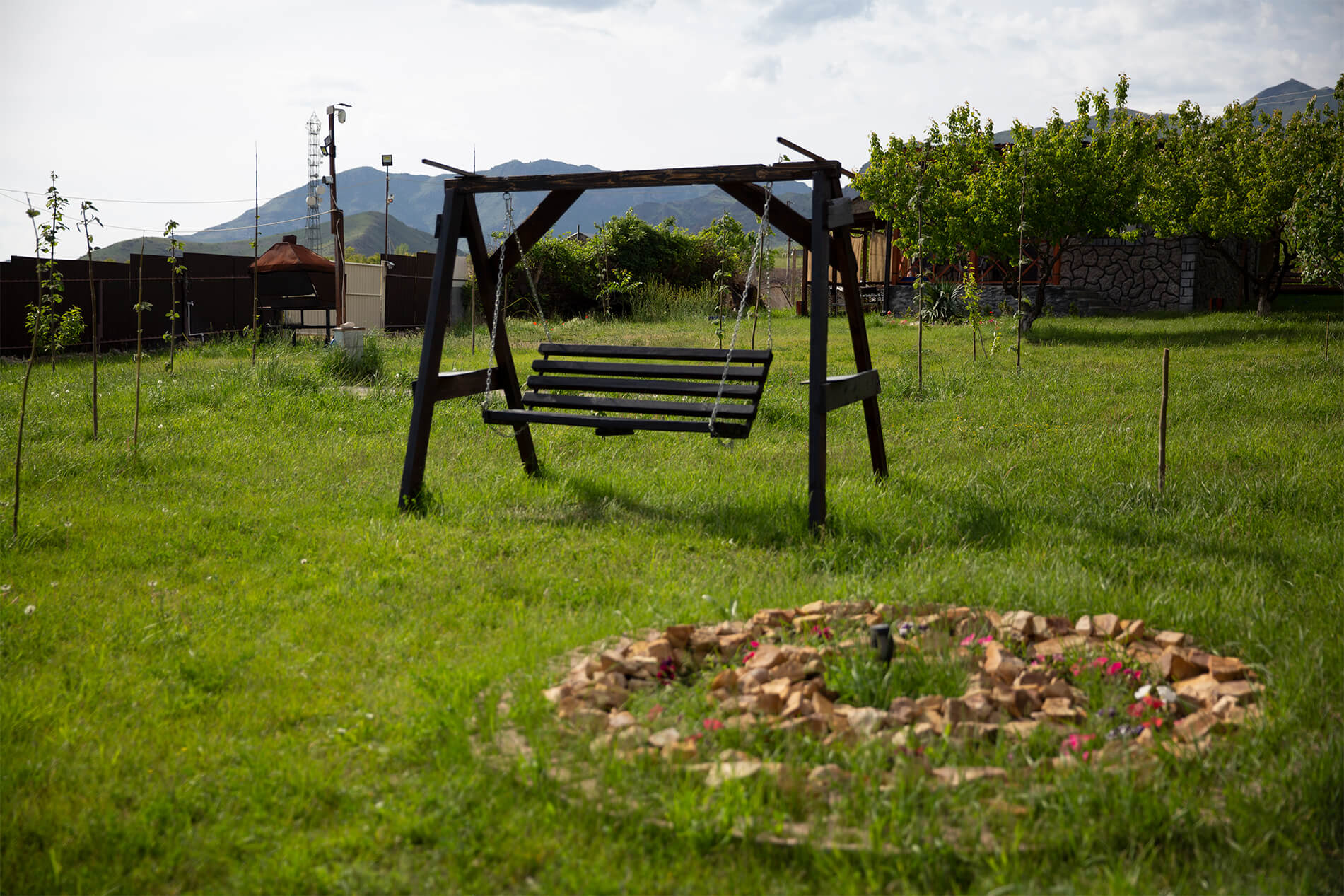A large area with a garden, its own gazebo and swings, silence and a beautiful view around. The house has all the amenities - dishes, a small stove for cooking. The house is located in a village, there is a grocery store nearby, also a convenient