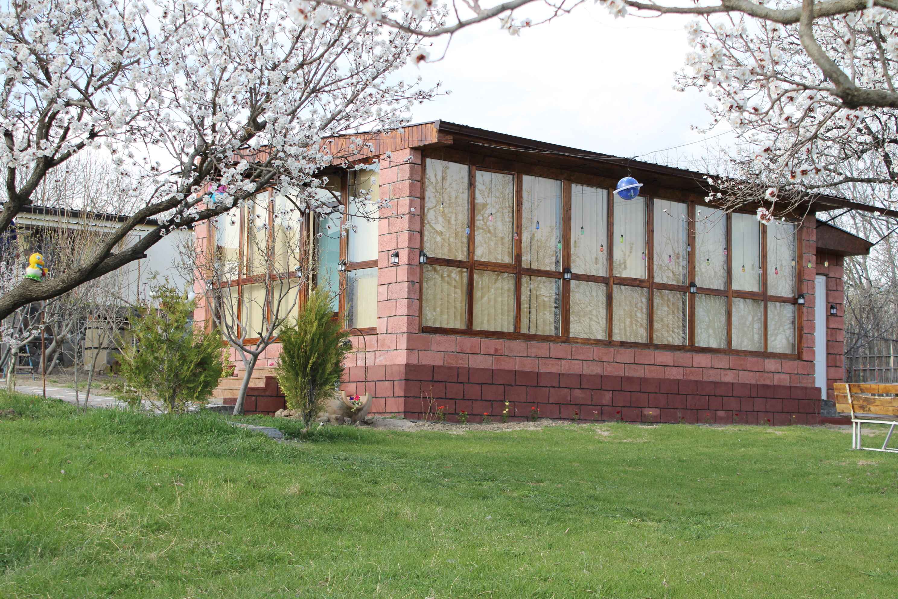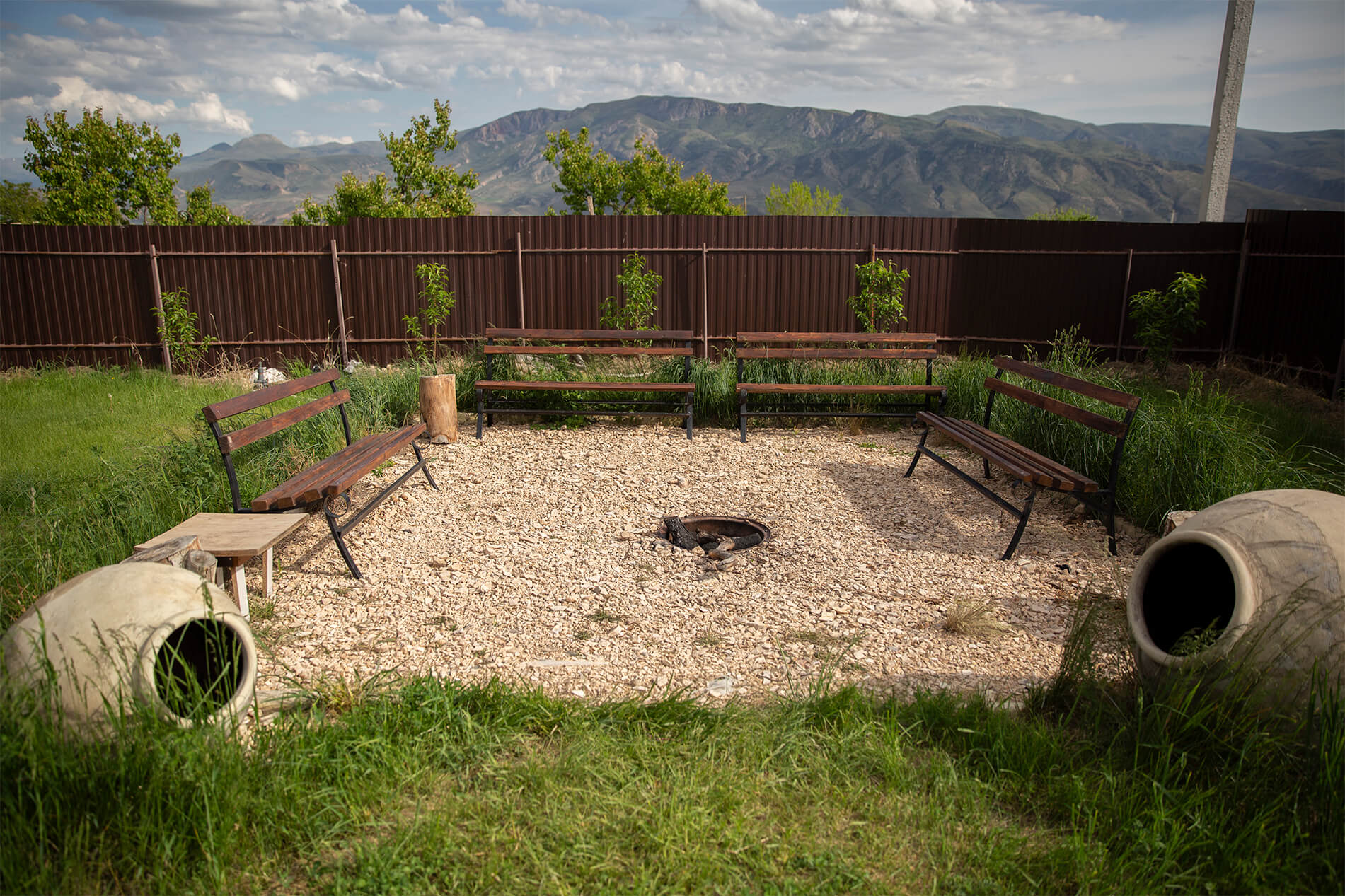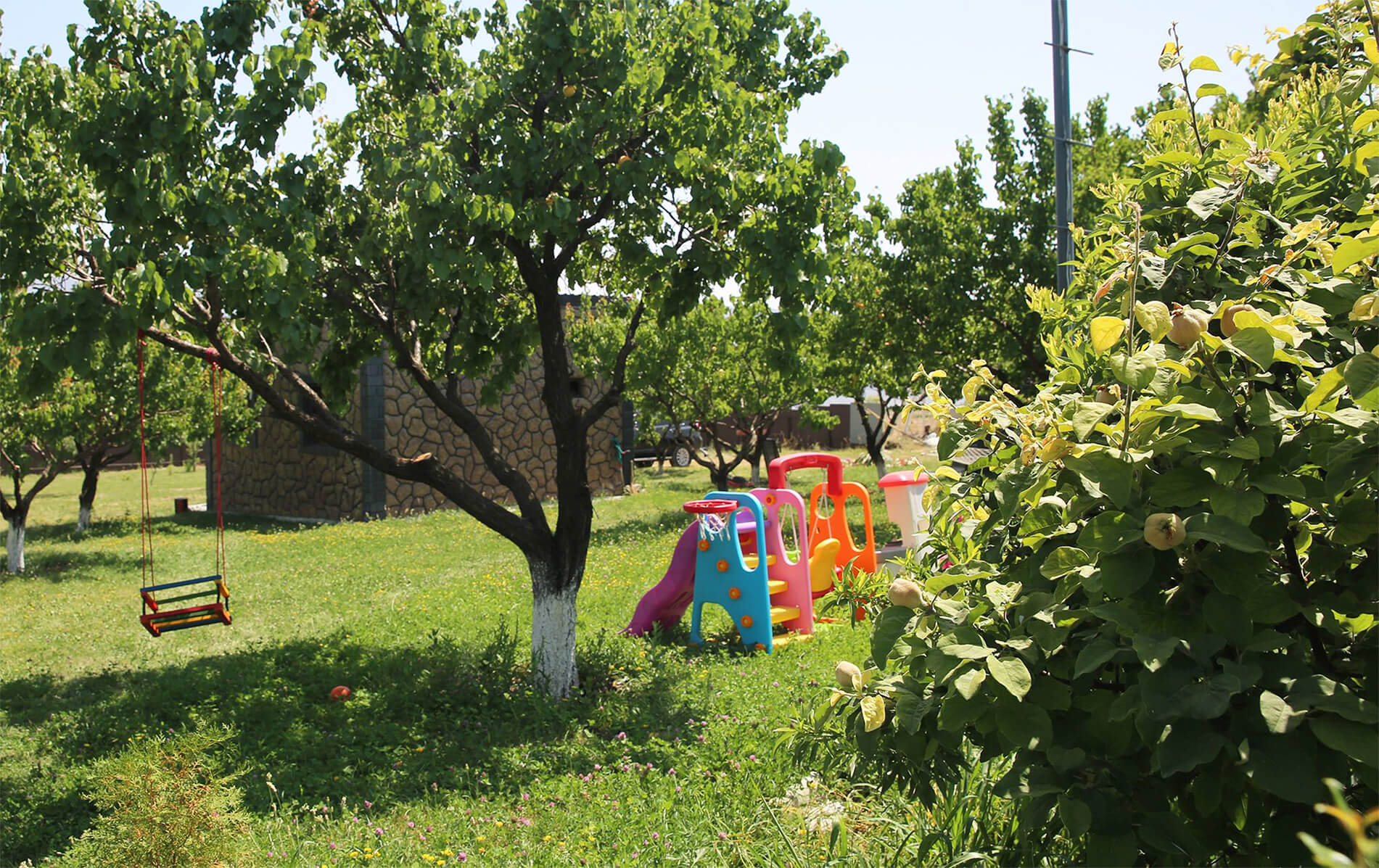 A large area with a garden, its own gazebo and swings, silence and a beautiful view around. The house has all the amenities - dishes, a small stove for cooking. The house is located in a village, there is a grocery store nearby, also a convenient