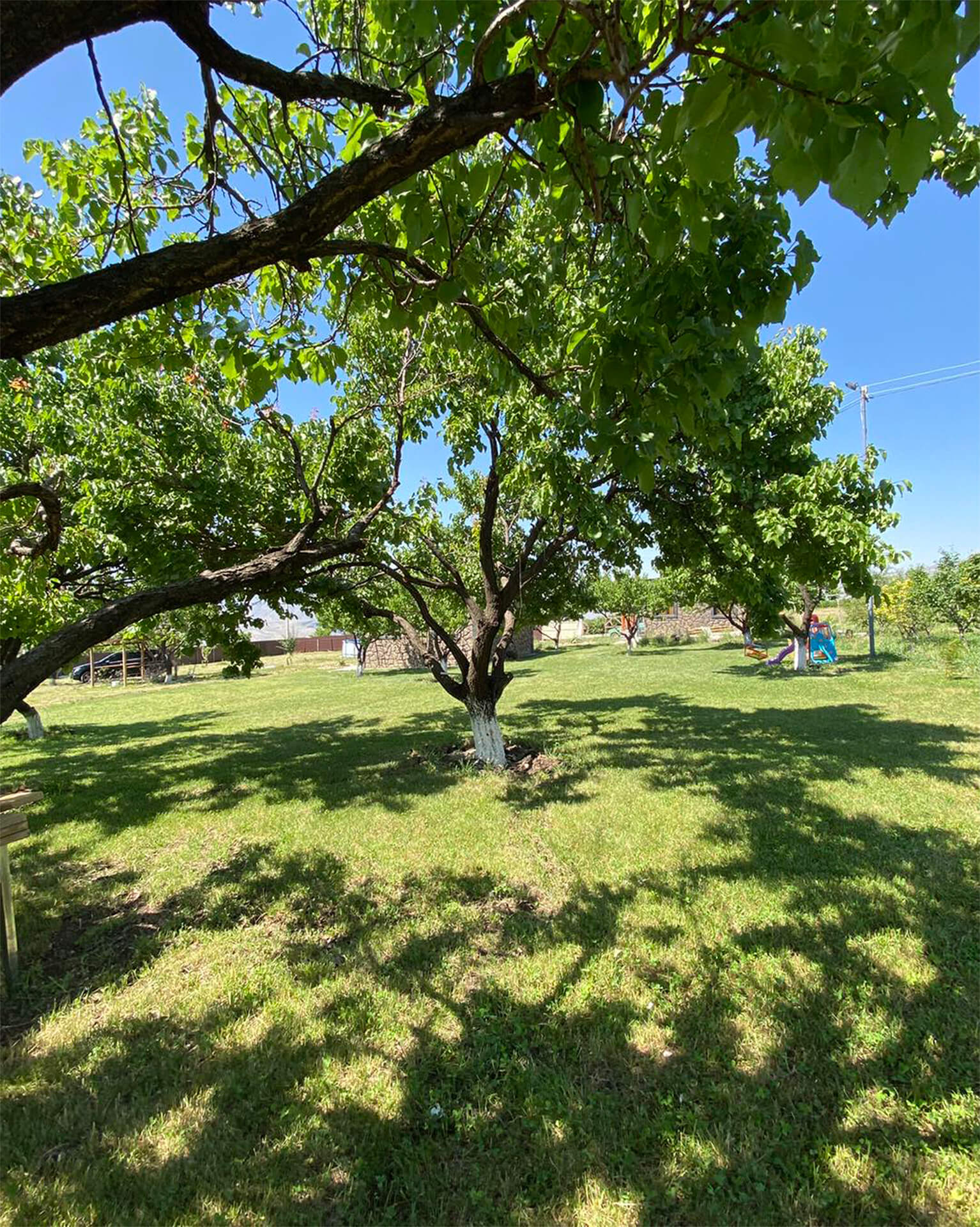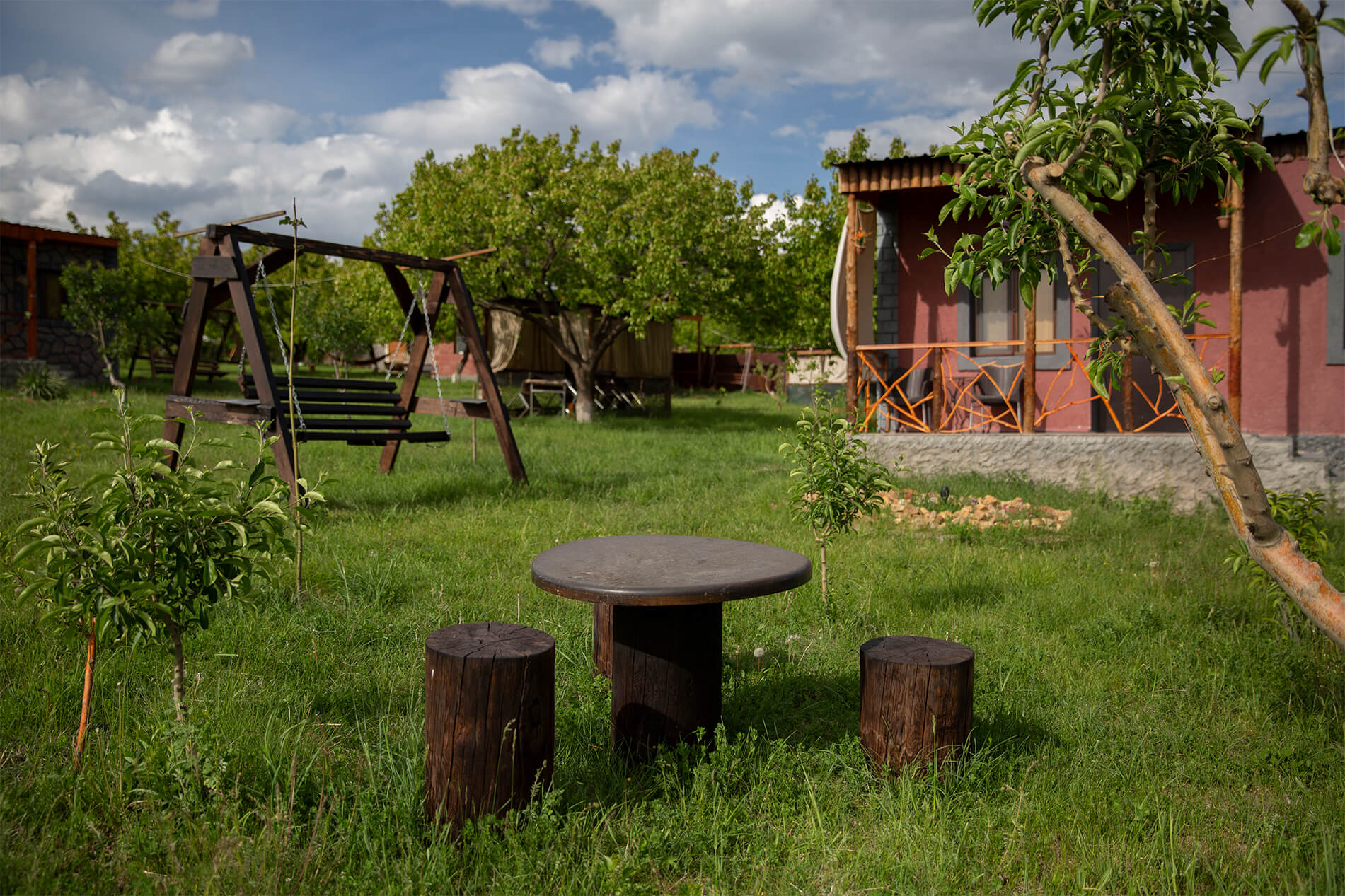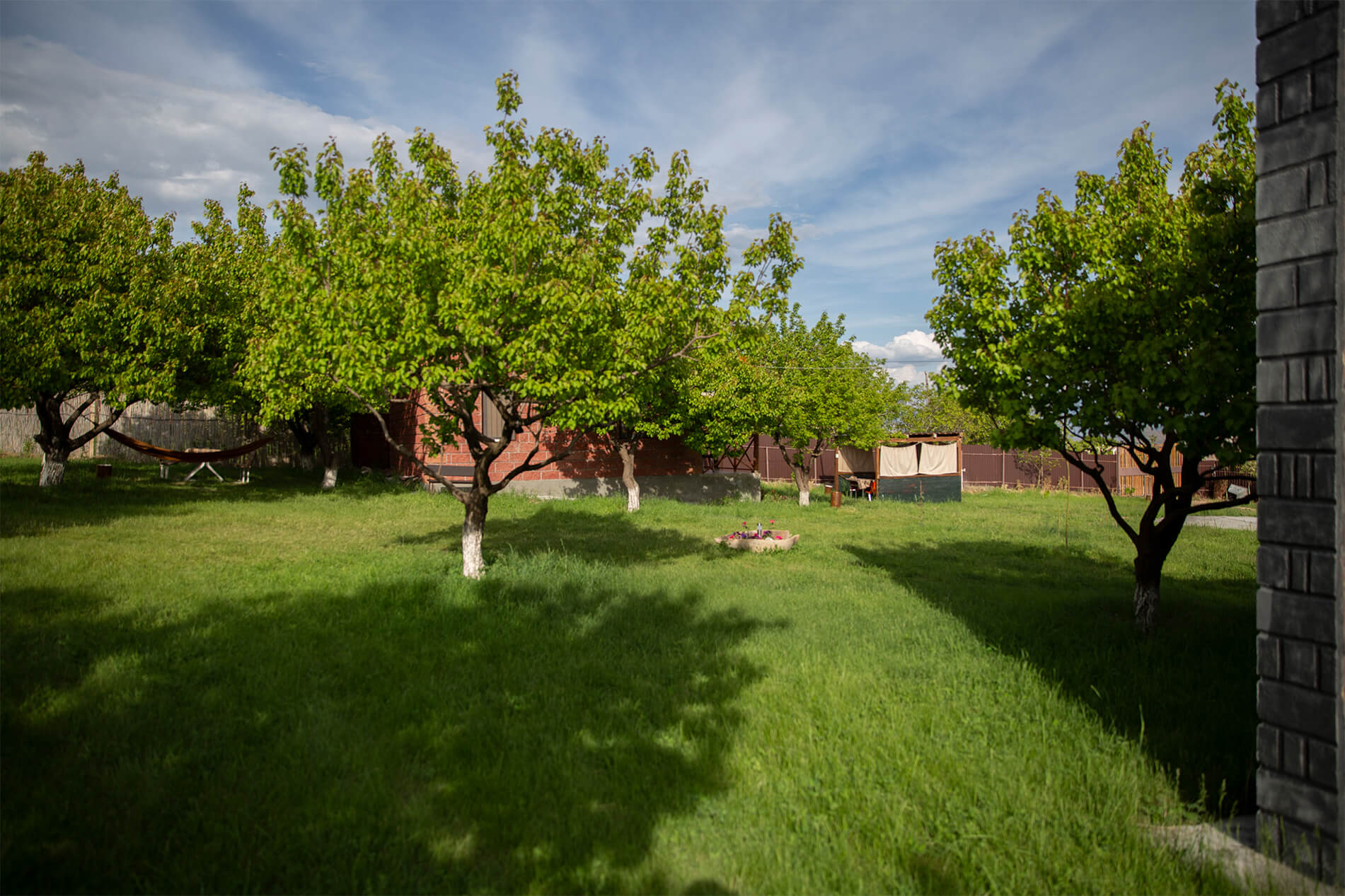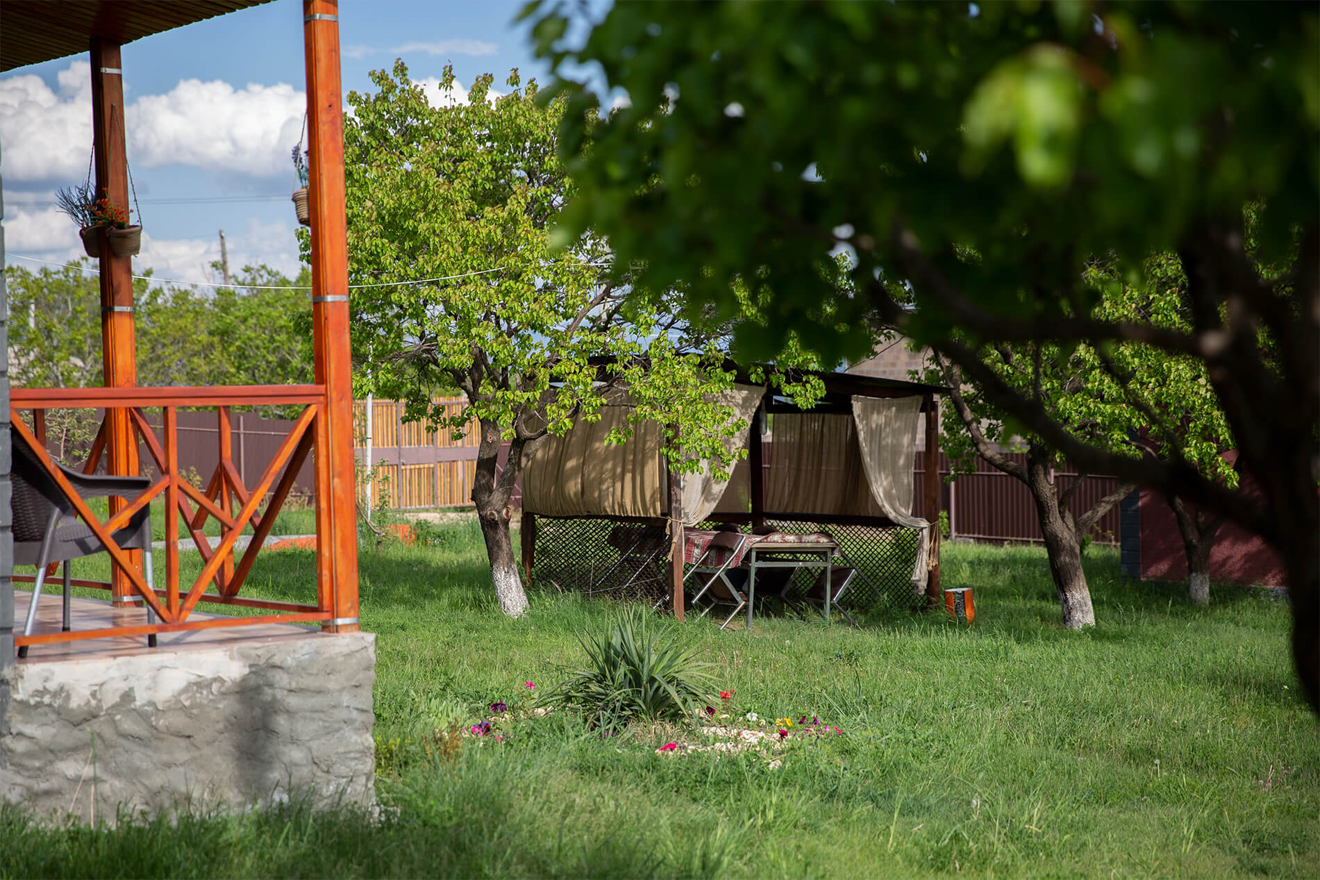 A large area with a garden, its own gazebo and swings, silence and a beautiful view around. The house has all the amenities - dishes, a small stove for cooking. The house is located in a village, there is a grocery store nearby, also a convenient